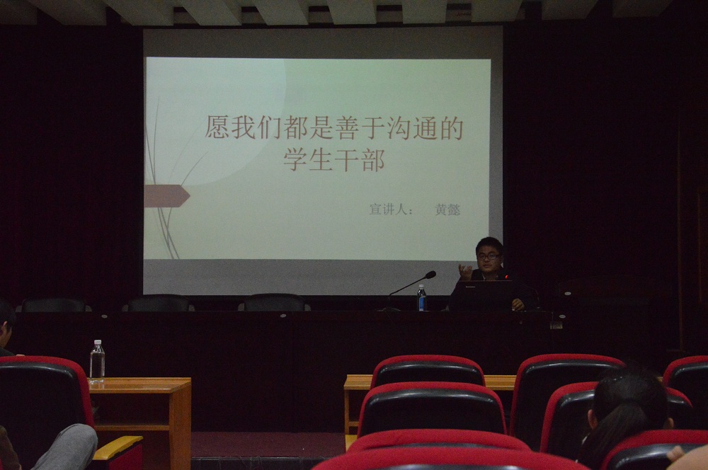 会议一开始,黄懿同学先向我们介绍了他曾经在社团中的工作经历,并且从中提出了此次讲座的重点——沟通。他将其分成三部分:向上沟通、向下沟通和水平沟通,同时结合自己在中特社团的经验指出了当前人际沟通交往间存在的主要问题。接着,他又根据自身的看法,分别在三个沟通方面提出了自己的一些建议,联系现实环境使会议内容更加具有说服力。在后来的同学提问这一环节,他亦从自身经历出发,根据实际情况给予同学们最满意的答复。最后,黄同学以“愿我们都是善于沟通的学生干部”这一主题思想结束了本次的讲座。