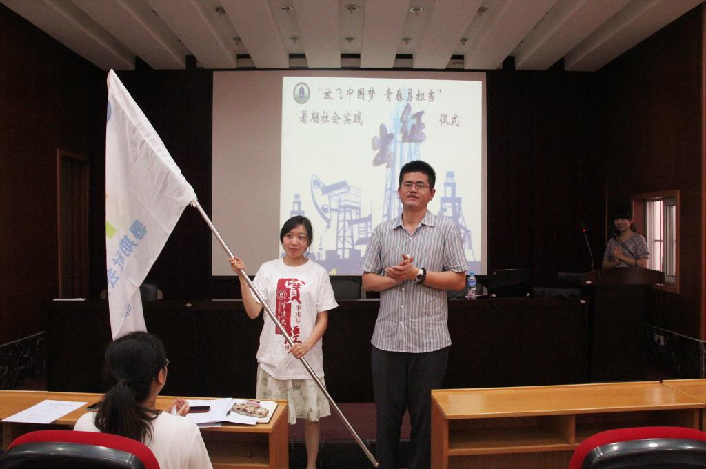 袁红辉老师宣布出征,并给社会实践代表赵琴同学授旗。授旗结束后,袁老师向同学们讲解了举办暑期社会实践活动意义及其参与的方式,希望同学们积极参与到社会实践中来,取得良好的实践成果,同时也要求同学们注意提高各方面的安全意识,做好安全防范。仪式上,沈妍伶老师介绍了学院暑期社会实践前期筹备情况。赵梦洁同学作了暑期社会实践代表发言。