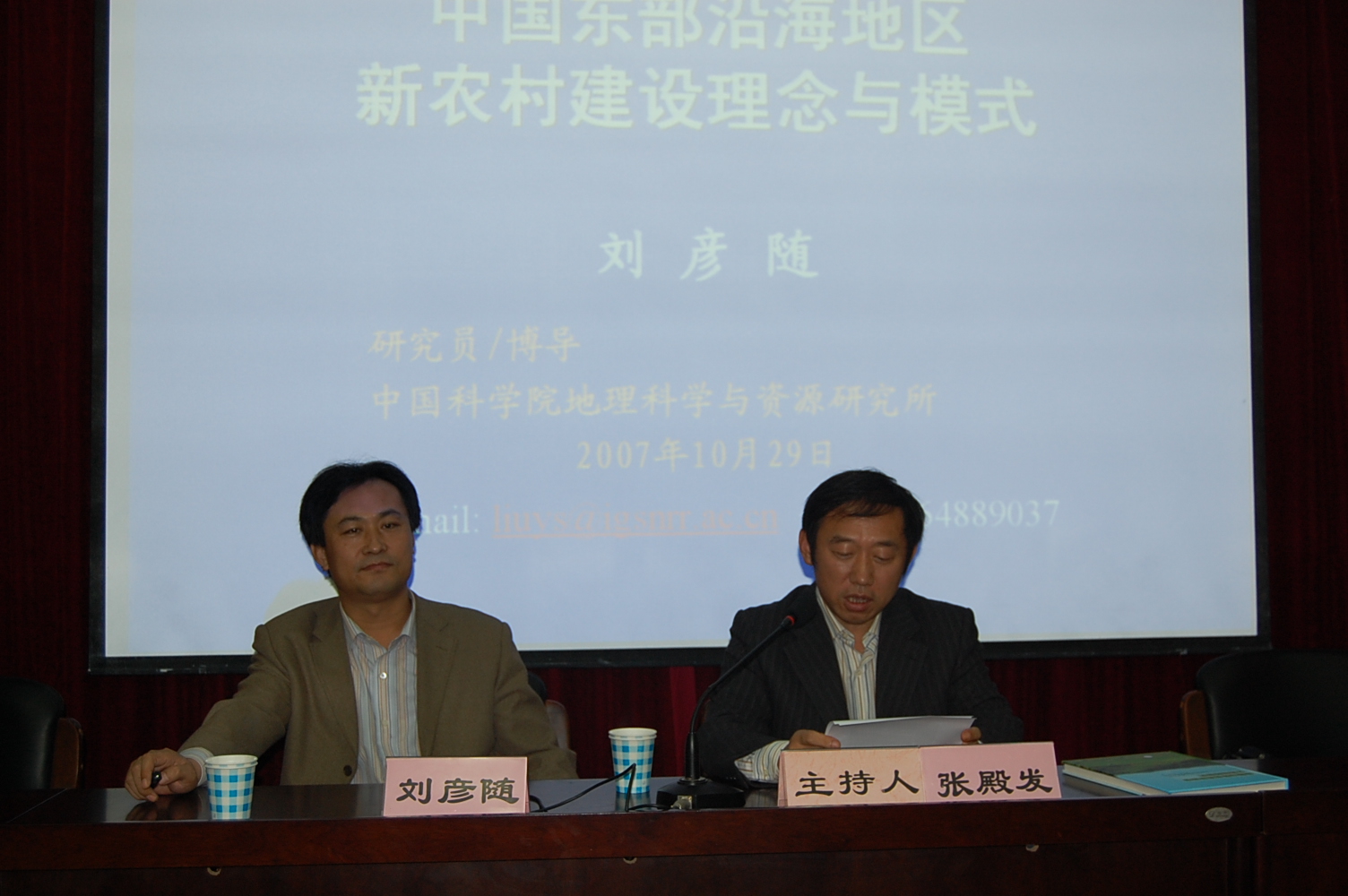 此次,刘彦随研究员的报告题目是《中国东部沿海地区新农村建设理念与模式》,从新农村建设的背景、实质与科学内涵,到东部沿海农业与农村发展基本态势,以及新农村建设理念、模式与战略。刘研究员给大家做了详细地讲解,并演示了大量有趣生动的案例,认为新农村建设是一个综合性的、系统化的目标体系,中国东部沿海地区新农村建设需要分层次分阶段分区域地去展开。最后,刘彦随研究员对中国东部沿海地区新农村建设提了几点新思考与新动向,引起了在座老师与同学的高度重视。