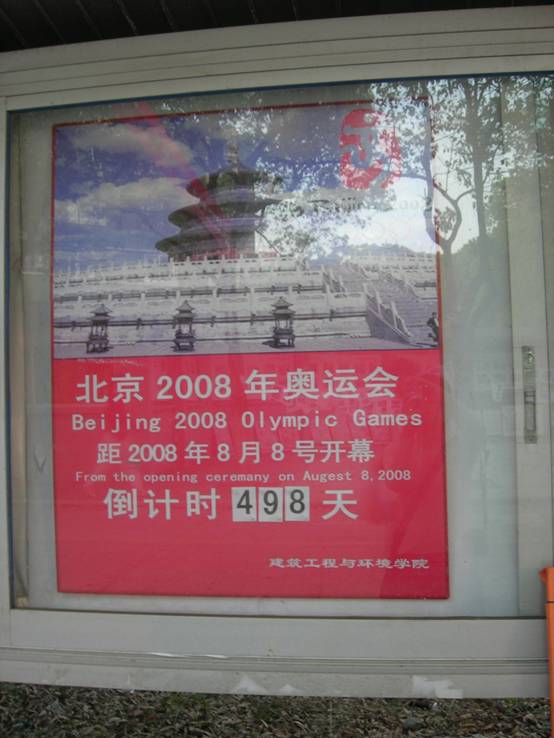 2008北京奥运会即将来临,宁大学子盼奥运迎奥运的热情甚高,为了激发广大同学们对奥运会的热情,在校园内营造一个良好的奥运氛围。吃瓜网 青年志愿者们主动联系了校党委宣传部并得到大力支持,在学校三角地带宣传部的橱窗内设置倒计时牌。