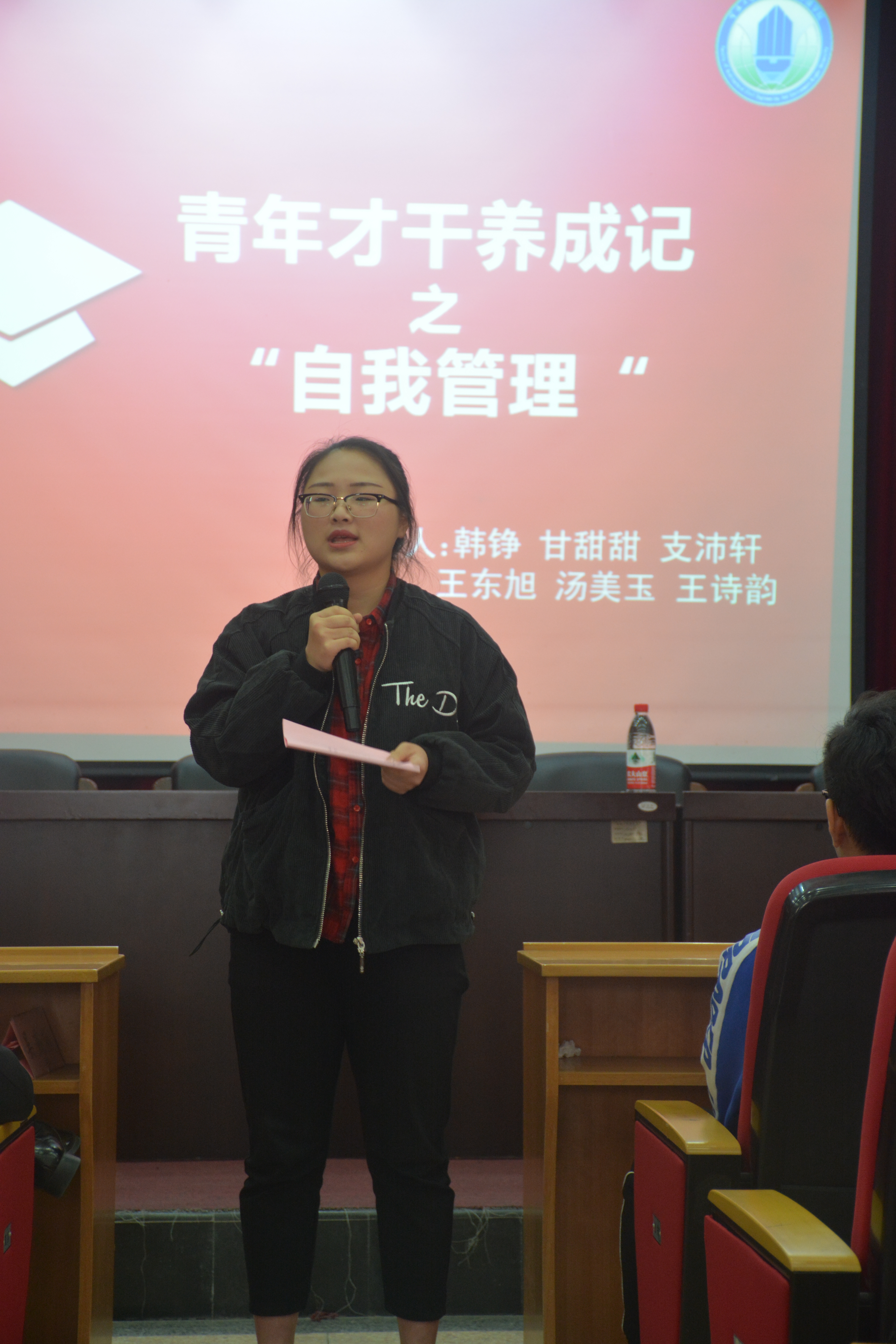 宣讲会开始,医学院主席支沛轩同学通过恰当的举例、生动的语言讲述了作为一名大学生应该如何进行自我管理,告诉我们要将需要自制力控制的事情培养成一种习惯。第二位发言的是马克思主义学院团委副书记王东旭,他总结了支沛轩同学的宣讲,然后发表了自己对自我管理的看法,告诉了我们在小事要适度地追随自己的内心,努力成为一个有趣的人。第三位发言的是校团委青年新媒体中心主任韩铮同学,她结合自身经历,告诉我们大学生的自我管理要做到松紧有度,在牢记自身担负的责任的情况下,适当释放压力,只有真正做到张弛有度才能真正学会自我管理。最后一位发言的是建工学院团委副书记邱晓珊同学,她先总结了前三位同学的发言,接着结合自身面试青年人才学院的经历,告诉我们面对压力要学会自我管理,相信自己,面对挑战。