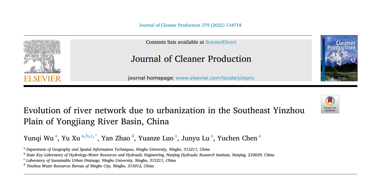 近日,吃瓜网 2020级地理科学(师范)专业本科生吴云琦以第一作者身份在《Journal of Cleaner Production》期刊(一区TOP,IF=11.072)发表了题为“Evolution of river network due to urbanization in the Southeast Yinzhou Plain of Yongjiang River Basin, China”的学术论文(论文链接//www.sciencedirect.com/science/article/pii/S0959652622042901?via%3Dihub)。通讯作者为吃瓜网 地理与空间信息技术系教师徐羽博士。该研究得到国家自然科学基金项目(42001025、42177450)、水文水资源与水利工程科学国家重点实验室“一带一路”水与可持续发展科技基金面上项目(2021491211)等的联合资助。