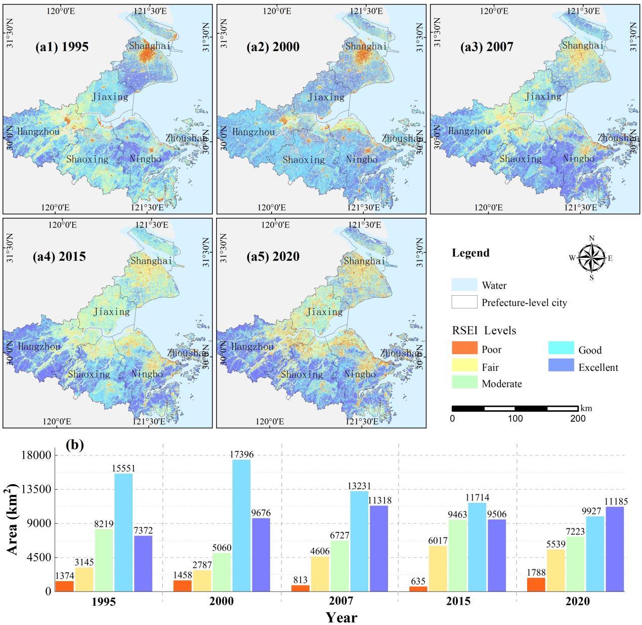 近年来,生态文明建设成为我国特色社会主义事业的重要内容,国家对于生态环境保护工作日益重视。当前,遥感技术以其快速、及时、大范围监测等优势被广泛应用于生态环境监测领域,例如徐涵秋提出的遥感生态指数(RSEI)可以直观客观评估生态环境。针对当前RSEI相关研究较少涉及群生态质量分异及其与土地利用变化的反馈机制,该研究以杭州湾大湾区为研究区建立遥感生态指数评估模型,监测近30年来湾区城市群的生态质量演变及其时空分异特征,深入挖掘区域生态质量与土地利用转化的定量关系。在RSEI的构建过程中,提出了一种百分位去噪归一化方法,克服了大范围区域噪声遍布的问题,使得基于RSEI的生态质量评估具备不同时期可比性。