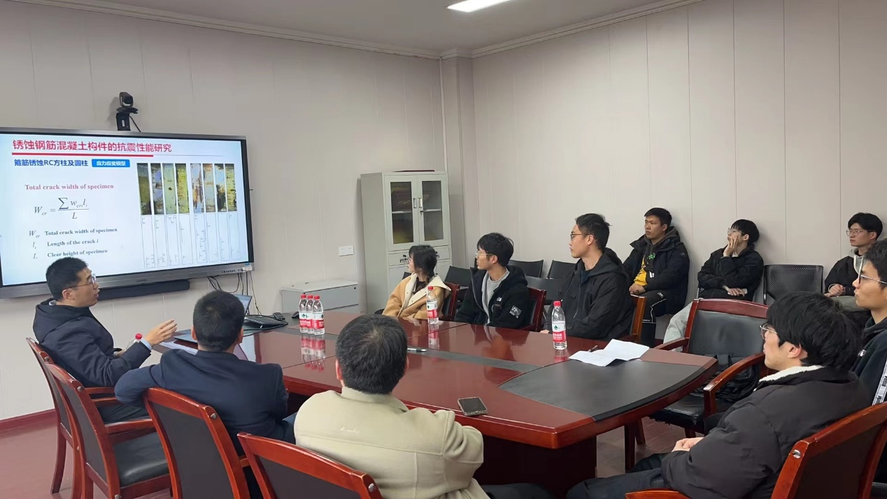 报告中,马老师首先介绍了锈蚀钢筋混凝土构件的危害及研究现状,随后详细介绍了其团队一系列锈蚀/未锈蚀钢筋混凝土构件的试验及理论研究成果,解释钢筋锈蚀对于钢筋混凝土构件地震破坏机理及抗震性能的影响,建立锈蚀箍筋约束混凝土本构模型及钢筋混凝土构件抗剪承载力计算模型,并探讨深度学习、数字孪生等技术在滨海钢筋混凝土结构全寿命周期抗震安全预警中的应用途径。报告结束后,马老师与学院师生进行了深入交流,详细解答了专业问题,讲座在热烈的氛围中圆满结束。