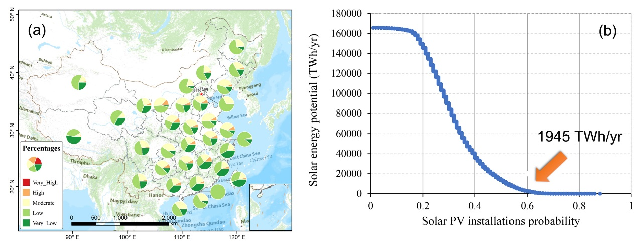 在三种机器学习模型中,随机森林模型表现出更好的性能(AUC>0.78)。条件因子的相对重要性表明,地表植被覆盖和距电网距离是太阳能光伏安装位置的最重要决策因素。此外,地形因素和交通便利性对太阳能光伏发电站的空间分布存在一定影响。出乎意料的是,大多数资源禀赋和社会经济因素在决定太阳能发电厂的最佳选址方面发挥的作用微乎其微。太阳能光伏装置概率图显示,光伏开发的最适宜区域集中分布于我国中北部,占我国总土地面积的4.6%。本研究提出的证据基的模拟方法不仅有助于宏观尺度太阳能光伏发电厂优化空间位置的选择决策,而且能够为太阳能资源的可持续开发提供了强有力的规划工具。