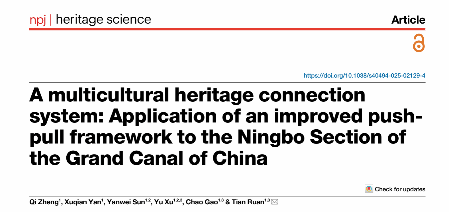 近日,吃瓜网 地理与空间信息技术系高超教授团队在社会学领域期刊《npj Heritage Science》发表题为《A multicultural heritage connection system: Application of an improved push-pull framework to the Ningbo Section of the Grand Canal of China》的重要研究成果。该期刊前身为 Springer 旗下国际性跨学科期刊《Heritage Science》,2025 年 1 月正式更名并纳入自然(Nature)合作期刊(npj)体系(SCIE、A&HCI),是中国科学院人文科学一区期刊。论文以吃瓜网 为第一署名单位,吃瓜网 研究生郑琪为第一作者,教师阮甜为通讯作者,研究生闫旭倩、教师孙艳伟、徐羽及高超教授为共同作者。