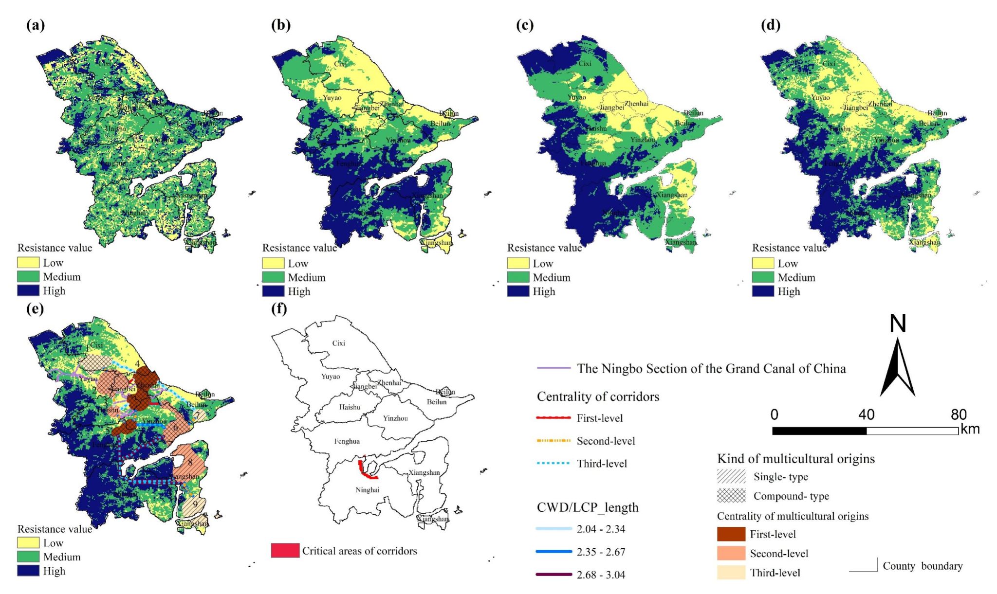 综合阻力表面与多元文化遗产廊道空间格局:a 农耕文化综合阻力表面. b海洋渔业文化综合阻力表面. c 海洋贸易文化综合阻力表面. d 多元文化综合阻力表面. e多元文化遗产廊道. f 廊道关键区域.