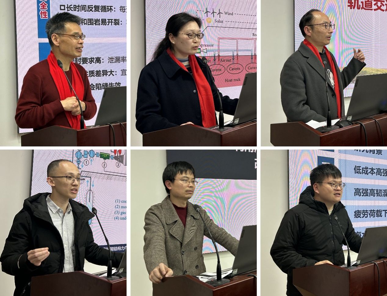 随后,实验室研究团队汇报了2024年度在地下洞室压气储能和能源地下结构领域所做的研究成果,并对2025年的工作进行了规划。实验室副主任邓岳保教授作了《轨道交通能源桩课题研究进展》的报告,周燕副教授做了《CAES硐室内温度和压强空间分布特征研究》的报告,周春恒副教授了《FRP-混凝土压气储能地下硐室衬砌结构力学性能研究》的报告,岑夺丰副研究员了《利用盾构管片换热器取热蓄冷改善地铁隧道热环境》的报告,沈亦农博士了《高强高韧混凝土钢筋粘结性能及其地下环境演化过程研究》的报告,徐晨博士了《压气储能洞室围岩与柔性衬砌系统协同承载机理》的报告。与会老师就地下压气储能和能源地下结构领域的前沿科学问题和新技术进行了深入的交流和探讨。大家边听边记边问,学术氛围浓厚。