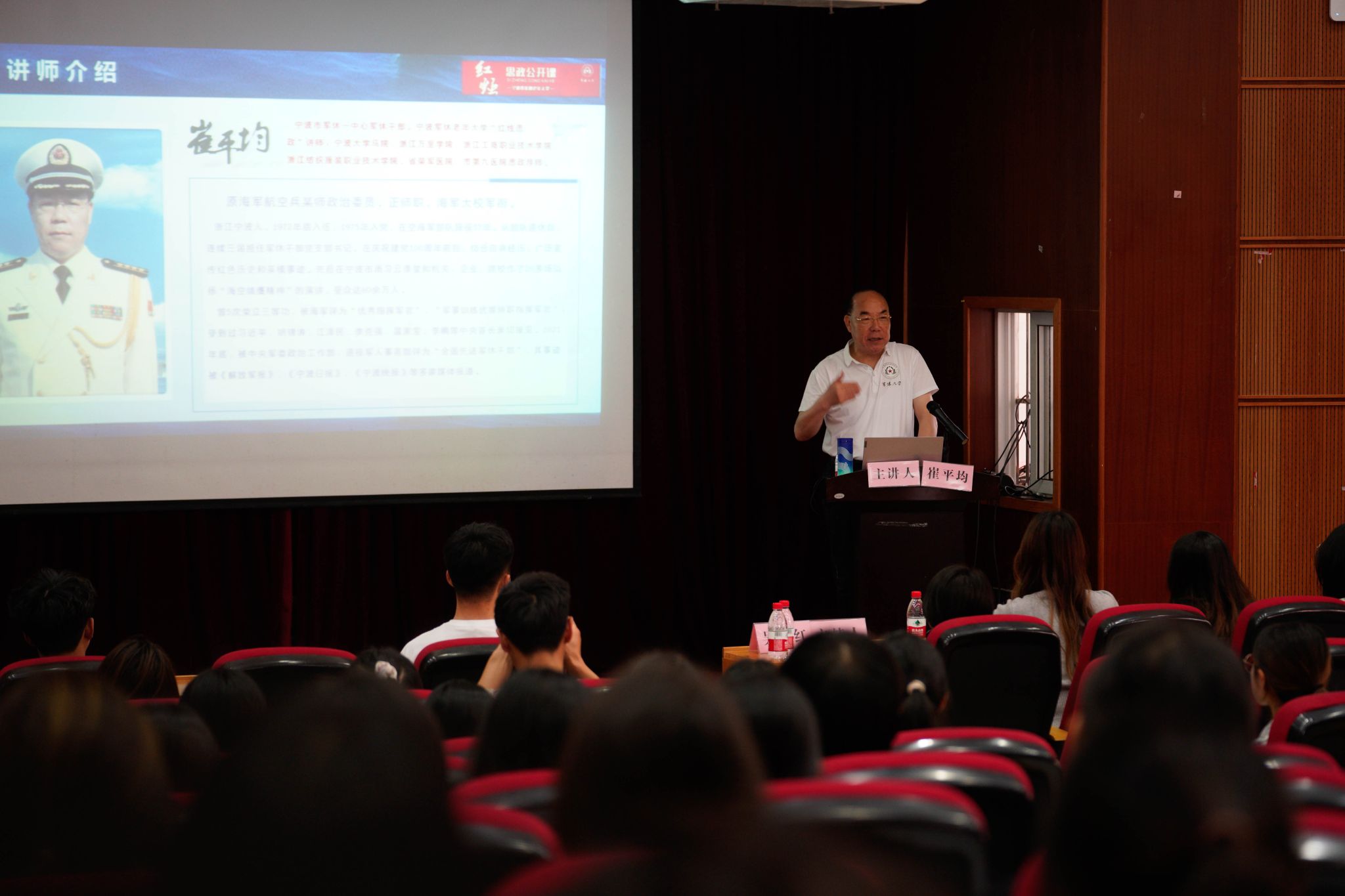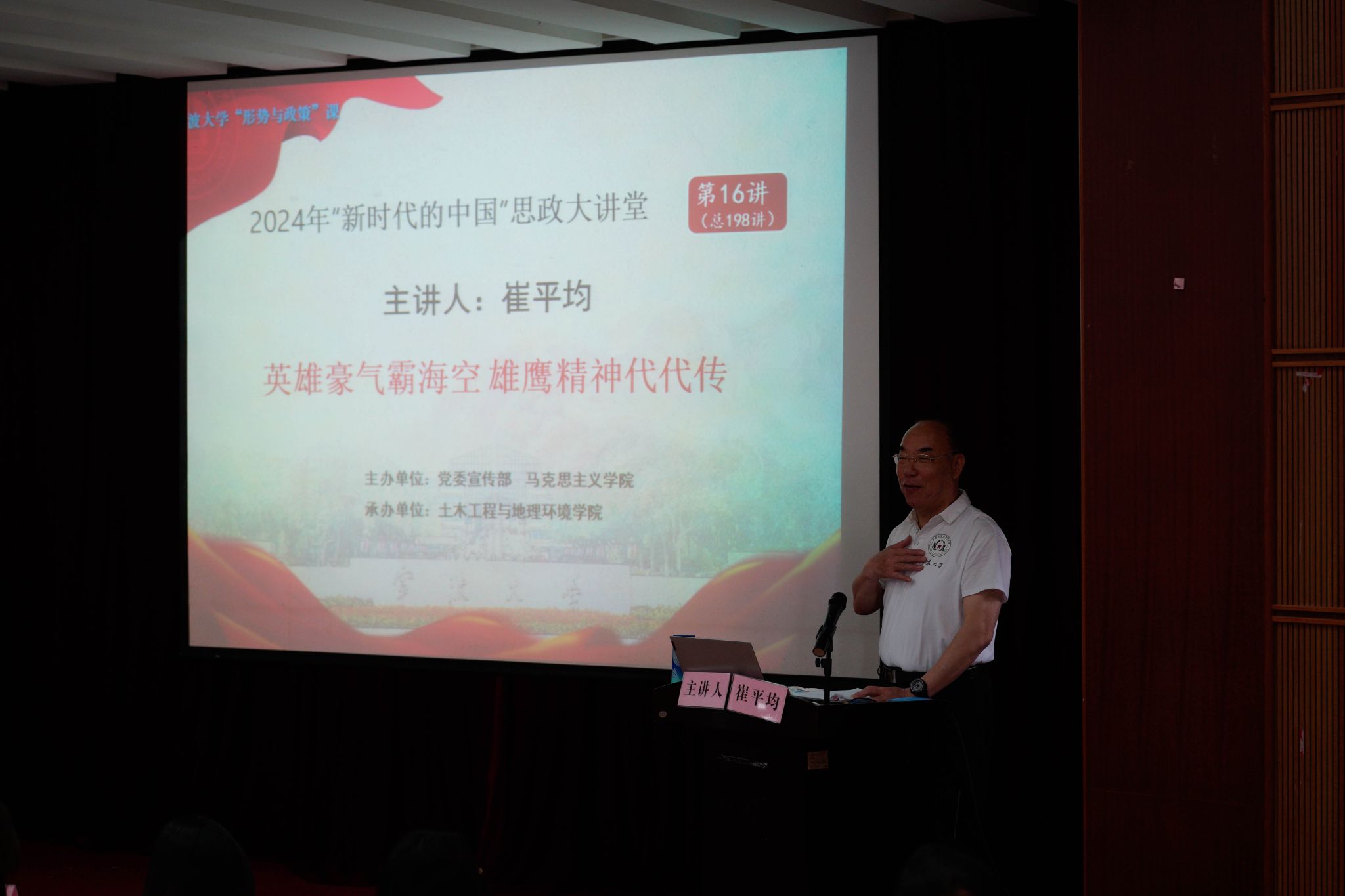 作为英雄部队“海空雄鹰团”所在师原政治部主任、师政委,崔老结合自身工作经历,从海上雄鹰的历史、主席点将不负重托、英雄辈出威震中外、雄鹰精神代代相传四个部分开展了生动讲述。他以抗美援朝战争时期的王牌飞行员王昆为例,讲述了“海空雄鹰团”惊心动魄的空战事迹,包括在浙东上空王鸿喜精准击落敌机,在海南岛上空舒积成对美军无人驾驶侦察机的致命打击等等,在场师生深受鼓舞,深刻地感受到了革命先辈舍生忘死、不屈不挠的民族精神,也纷纷表示要以实际行动向英雄致敬,以扎实的知识学识建设祖国、报效国家。