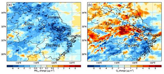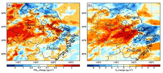图1. 城市扩张对长三角地区日均PM2.5和O3日最大8小时浓度的影响(黑色矩形表示城市扩张区域)
