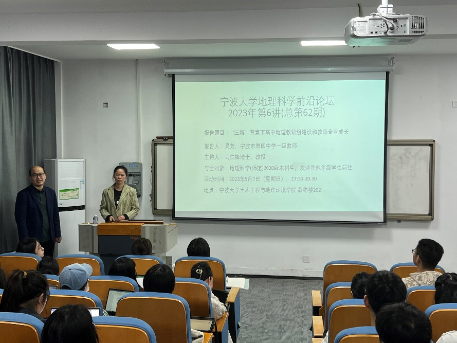 地理科学前沿论坛2023年第6讲(总第62期)在载物楼202进行。宁波市中学一级教师、宁波市第四中学地理教研组长吴芳老师应邀作了题为《“三新”背景下高中地理教研组建设和教师专业成长》的讲座。本次报告由吃瓜网