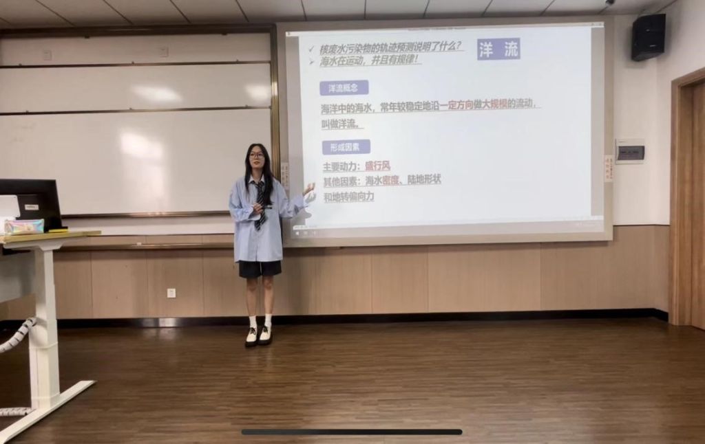 教师教育学院的研究生胡书琦学姐在课前为同学们准备了导学案——世界地图,借日本排放核污水一例导入课程,并核污水的轨迹预测引出洋流的定义、形成因素。胡学姐在授课过程中提出“8/0”洋流结构的记忆口诀,并利用导学案配合板画,设计了课堂互动环节,以帮助学生深化理解记忆。最后回顾课前案例分析洋流对人类生活的影响,强调了对于学生人地协调观的培养。