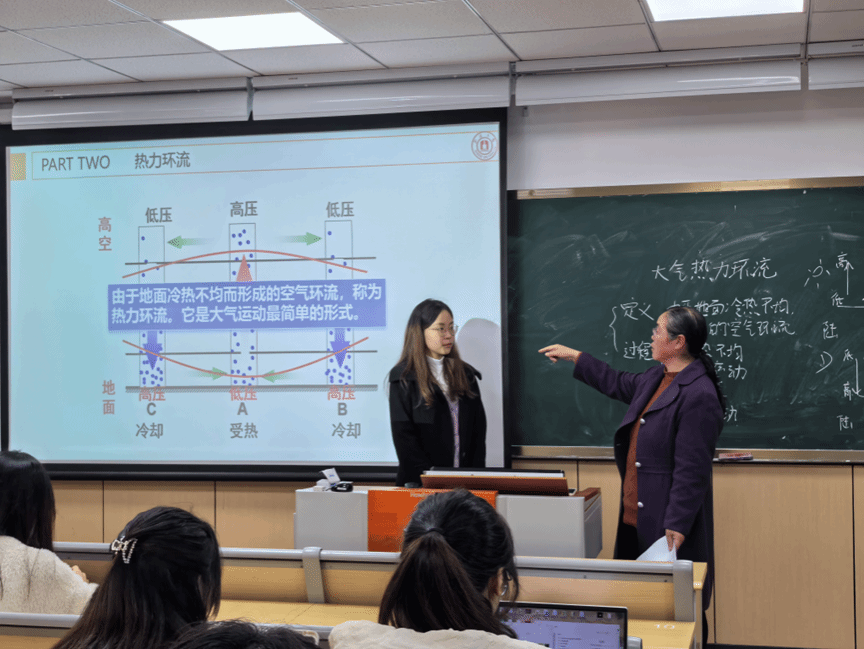 陈安迪同学选取《大气热力环流》一课来试讲,运用多媒体动画分步模拟大气热力环流形成原理和山谷风形成过程。吴老师针对陈同学的动画模拟的细节部分讲解提供了更细致的改进方案。徐老师则强调了板画讲解的科学性和合理性。