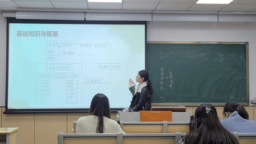 程萍同学选择“农业区位论”进行试讲,利用气候降水图、南疆、美国棉区分布图等多则图文资料,介绍了南疆棉花和美国棉花种植的农业区位的自然因素。吴老师评价,在讲解人文地理相关知识时,要注重内在逻辑的清晰,并在此基础上来进行课程设计,避免出现知识不落实地的问题;还要贴合学情,合理设置课程难度。