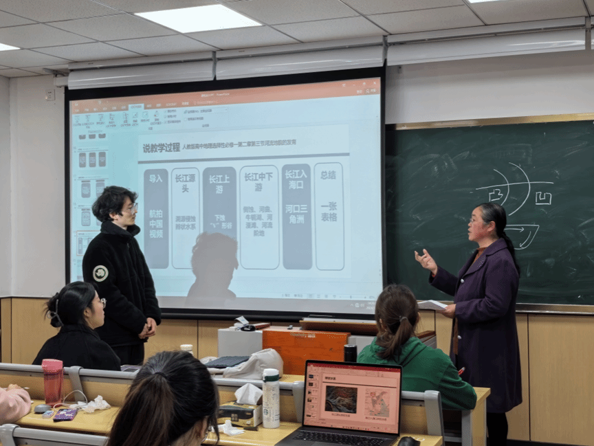 吴协辉同学选择《河流地貌的发育》进行试讲,利用剖面图、原理图等多项资料介绍了长江源头、上游、中下游和入海口处的典型河流地貌。徐老师评价选考课程的教学要注意与学考教学进行区分,适当选取几个较为典型的河流地貌对其原理进行重点讲解。吴老师评价对于本节课的教学可以适当附上长江流域的水系图,根据水系图展开讲解,可以更加直观,便于学生理解。