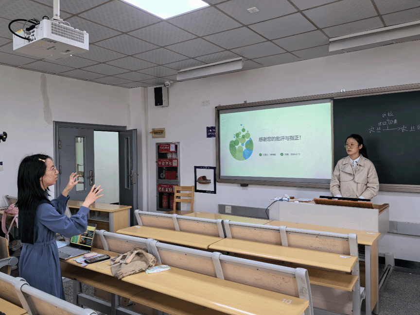 李丹蓉同学选择人教版必修二第三章第一节“农业区位因素及其变化”为教学内容,以宁夏中卫硒砂瓜一案到底,对农业基本概念进行介绍,根据五则紧密联系的材料,探索影响农业区位选择的区位因素。季璐迪对板书速度、课堂参与度进行了探讨。张老师对材料的选取表达了肯定的,并建议注重课堂上专业性与趣味性的平衡,教师可以走下讲台增加与学生的互动性。徐老师肯定了教学的思路,同时也提出了要多注重细节与逻辑的建议。