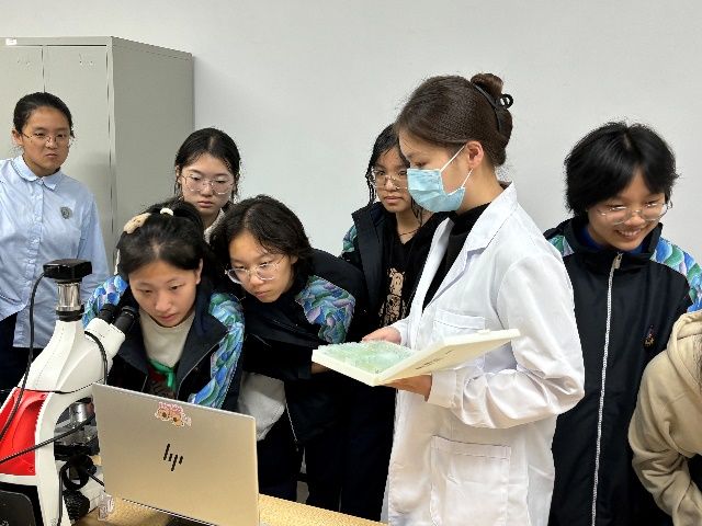 在水文地理与生态安全实验室中,四中学子在研究生志愿者的互动下了解水生生物有哪些,什么作用等,观看了藻类科普动画,分类群观察水生生物,如藻类、浮游生物和底栖动物,了解每个分类群对于理解水质的衡量指标多样性价值。