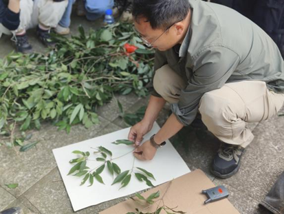 结束样方调查后,杨晓东老师在山顶示范植物标本的科学制作流程。