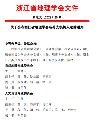 2022年11月18日,浙江省地理学会第十三次会员代表大会在杭州市浙江大学举行。中国科学院院士杨树锋教授,中国地理学会副理事长兼秘书长张国友研究员,浙江省科学技术协会党组成员、副主席武传宇教授等领导参与会议并发表讲话。