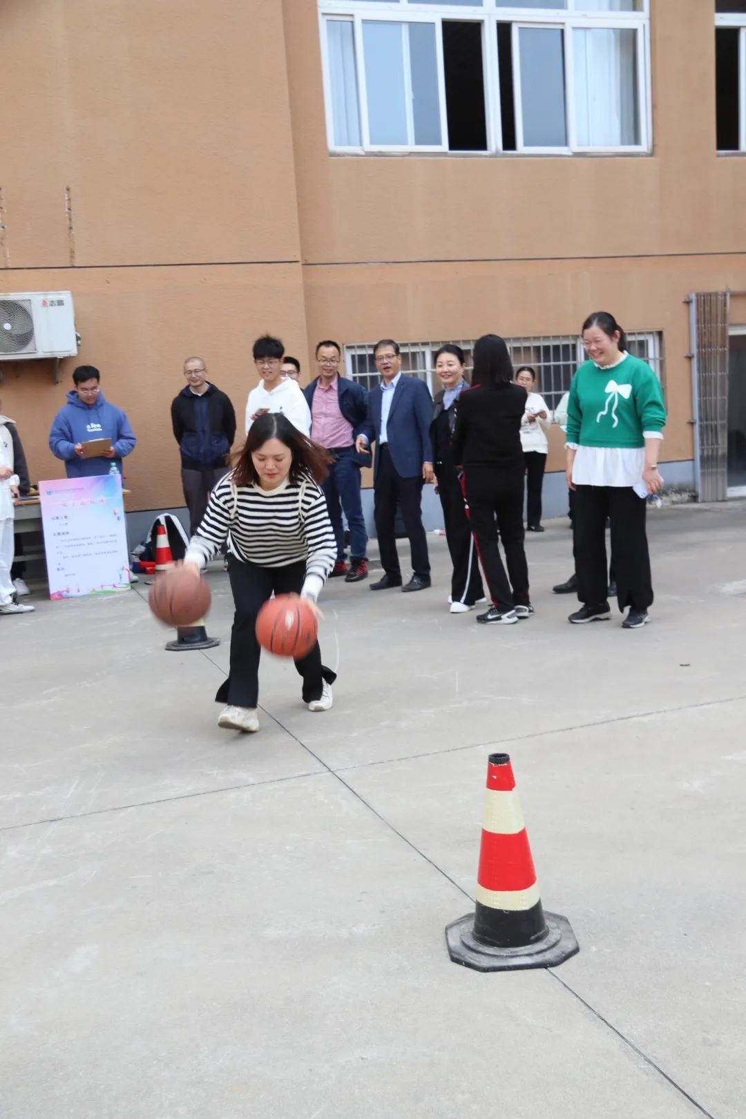 别看平时文质彬彬的老师,玩起来也一点都不逊色!老师们双手运球,平稳地绕过障碍,铆足了劲儿不顾一切向前冲!