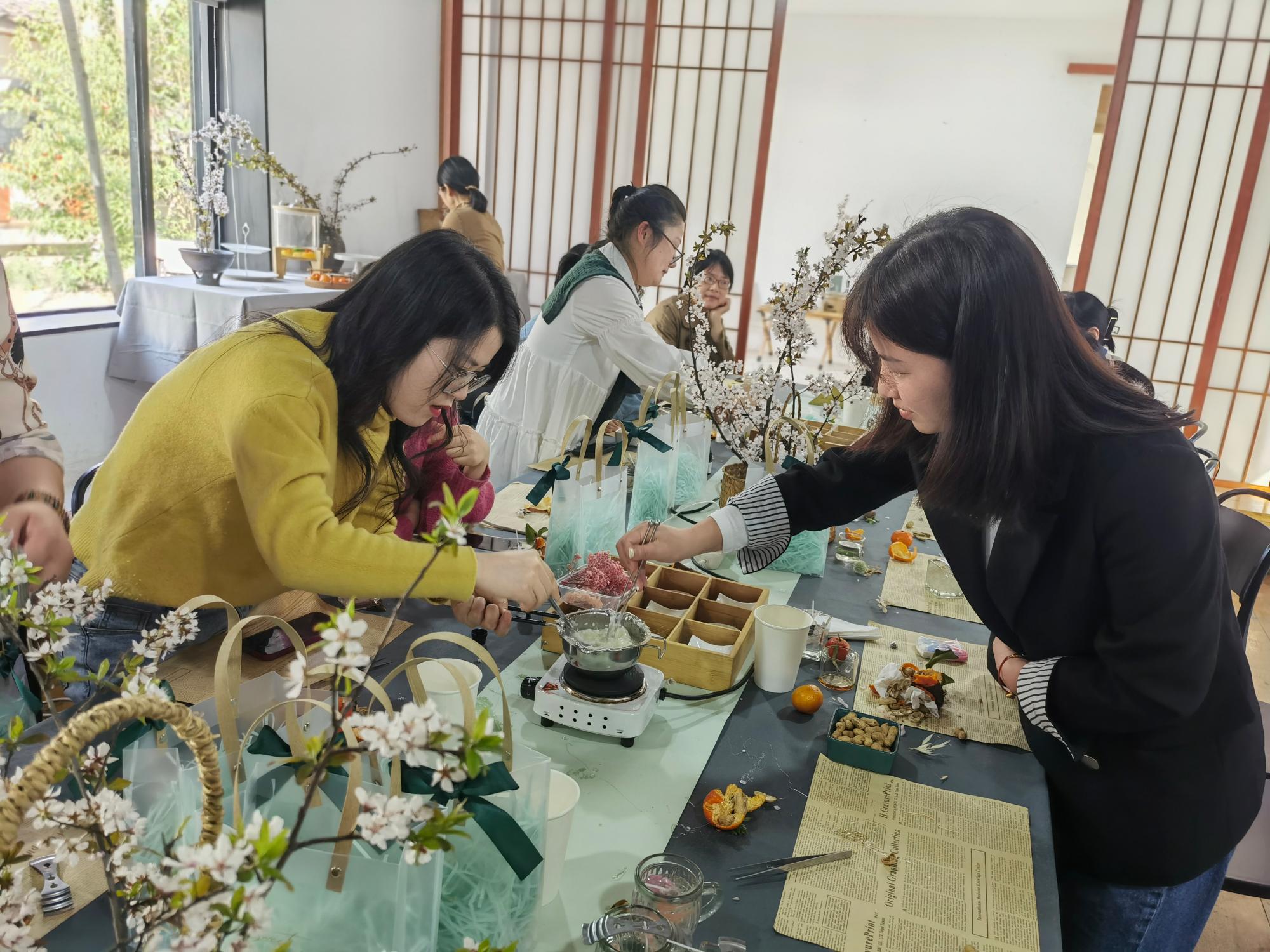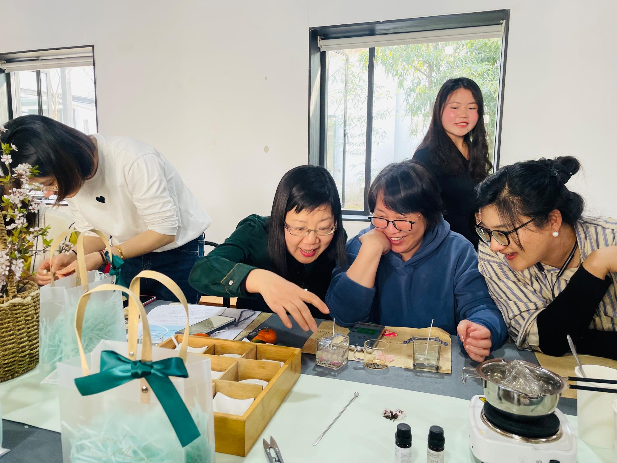 伴随着午后暖暖的阳光和精致的茶点,女教工们开启了一段有趣的香薰蜡烛手工制作活动。专业的制香老师详细地讲解和指导加热、调香、倒入模具、装饰脱模等制作环节,女教工们纷纷将豆蜡加热溶解后精心的和香氛精油调制融合,再小心翼翼的倒入模具,等待冷却过程中大家认真构思、巧妙搭配,在巧手翻飞下,完成了各式各样色彩缤纷、春意盎然的纯手工作品,让美好春色留在了香薰蜡烛里。