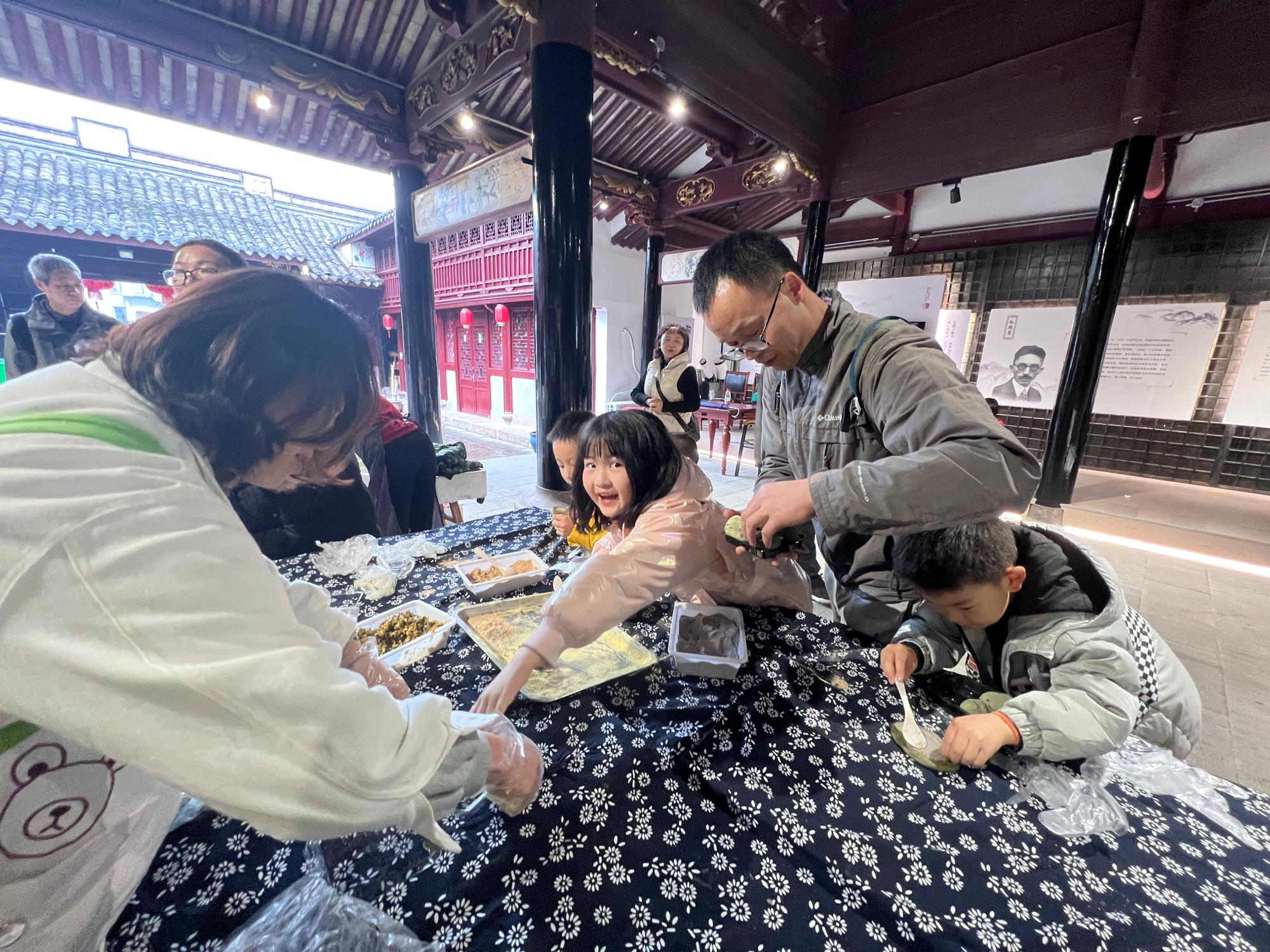 午饭后,老师们乘车前往青云古村进行参观游览。走进青云古村,门前河流经村庄,民宅依河而建,两岸香樟吐翠,亭台、廊桥古色古香,气派的洋房之间保留着一幢幢民国时期白墙黑瓦、飞檐翘角的徽派建筑。水井、老街、亭台、牌坊交相辉映,随处可见普通农家的生活场景、处处彰显着有近千年历史文化的名村韵味。随后老师们在文化礼堂里亲自动手体验传统特色小吃青团的制作,欢乐的时光很快就过去了,老师们集体乘车回到校园,愉快的春游活动告一段落。