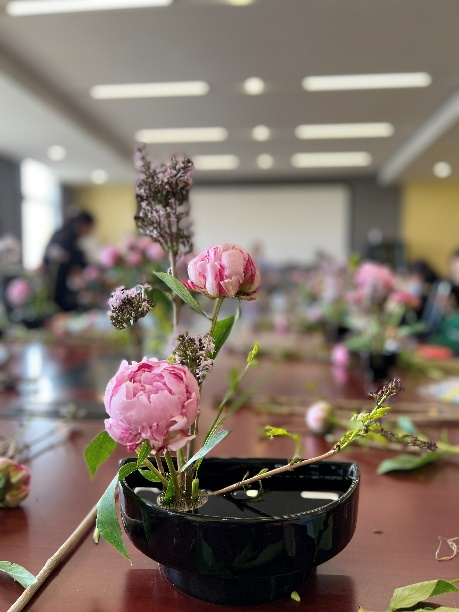 中国古典插花由来已久,源于对自然的一种敬畏。活动中采用芍药和丁香中式应季花材,从植物属性出发带给所有老师们和校友们“四时有序”的自然力量,感受到与自然的联结,也看到生命的每一次努力绽放,是花的力量,也是我们用心生活的力量。从立意、构图、色彩至意蕴皆是对传统的诠释,这样的作品才具有深刻的人文情感和意蕴风骨,生命也在此延展、融合。