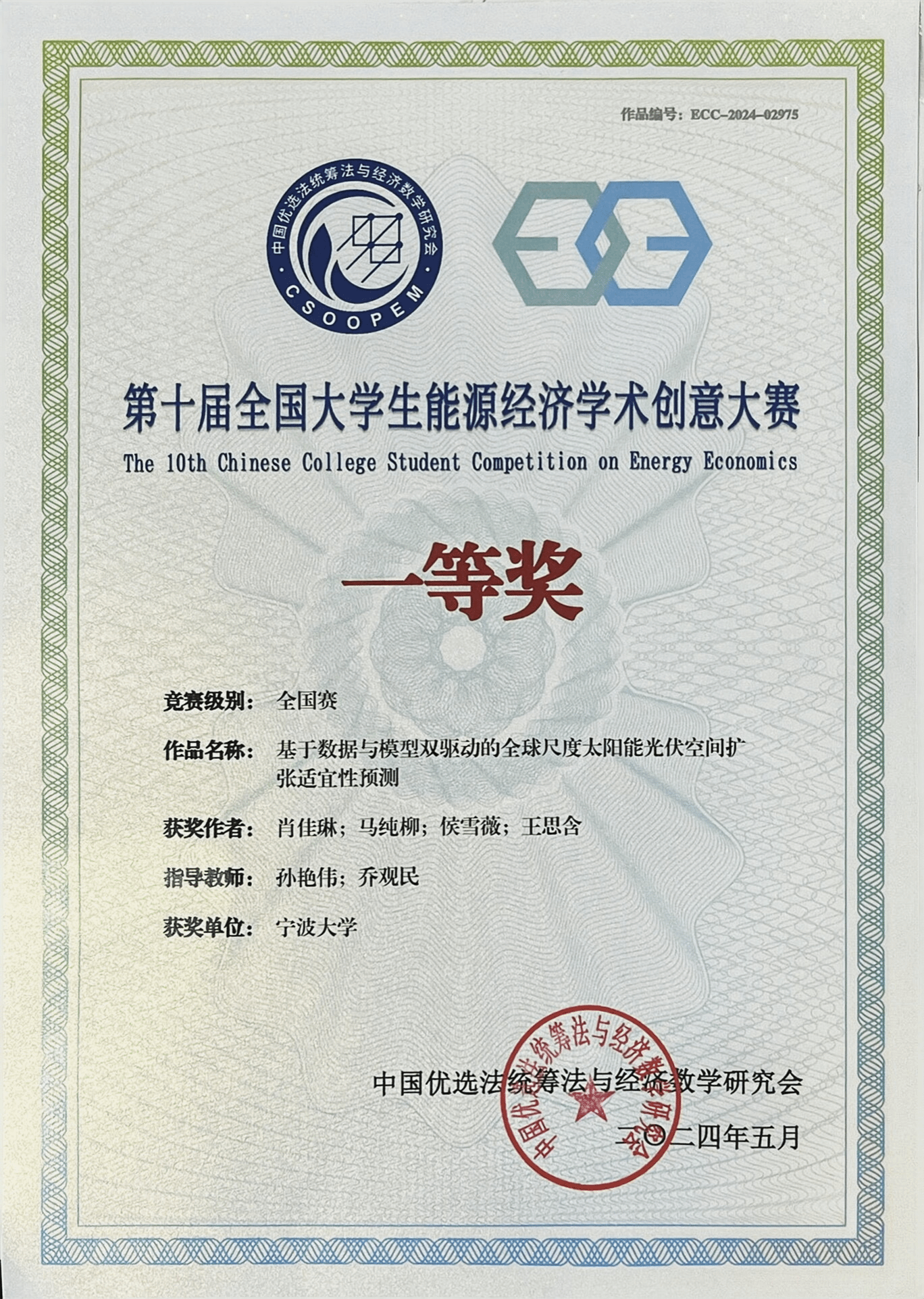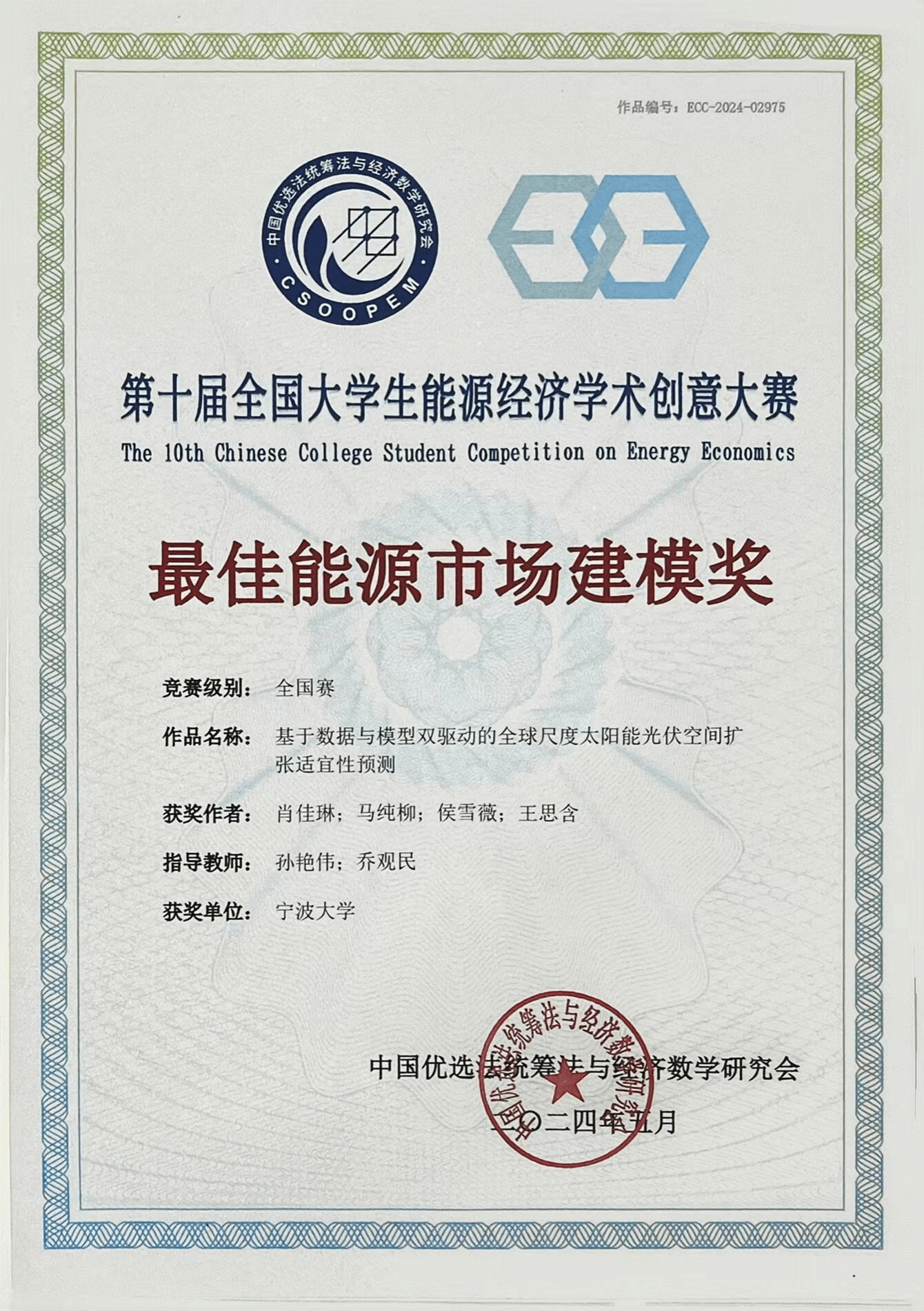 全国大学生能源经济学术创意大赛由中国优选法统筹法与经济数学研究会主办,旨在更好地服务于能源经济领域专业人才的培养,助力我国早日实现碳达峰、碳中和的目标。赛事已被高教会列为全国大学生一级赛事,为大学生的学术创新、才华展示提供了舞台,也为促进多学科交叉解决能源经济和低碳发展中的重点难点问题提供了平台。本次大赛共收到来自561所院校报名,其中提交有效作品8963项,经过校赛和省赛激烈角逐,最终推荐入围国赛作品895项。经过通讯评审和专家会评,共评出148组作品进入总决赛。最终经过现场激烈的陈述和答辩,吃瓜网 地理与空间信息技术系队伍从众多队伍中脱颖而出,取得最佳能源市场建模奖和国赛一等奖的好成绩。