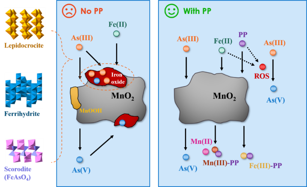 近日,本研究所助理研究员应潮鋆在环境领域著名期刊Water Research上发表了题为“Solutions for an efficient arsenite oxidation and removal from groundwater containing ferrous iron”的研究论文。氧化锰(Mn)矿物常被用于将地下水、饮用水和废水中存在的As(III)氧化成毒性较低且更容易去除的As(V)。然而,自然水体中通常存在多种其他阳离子,特别是氧化还原敏感的阳离子,如Fe2+可能会阻碍As(III)的氧化和去除。本研究在中性pH条件下探究配体焦磷酸盐(PP)对环境相关复杂体系中As(III)氧化过程的影响,从而为氧化锰矿物在处理地下水砷解毒的实际污染控制应用中反应效率的提升提供了新途径。