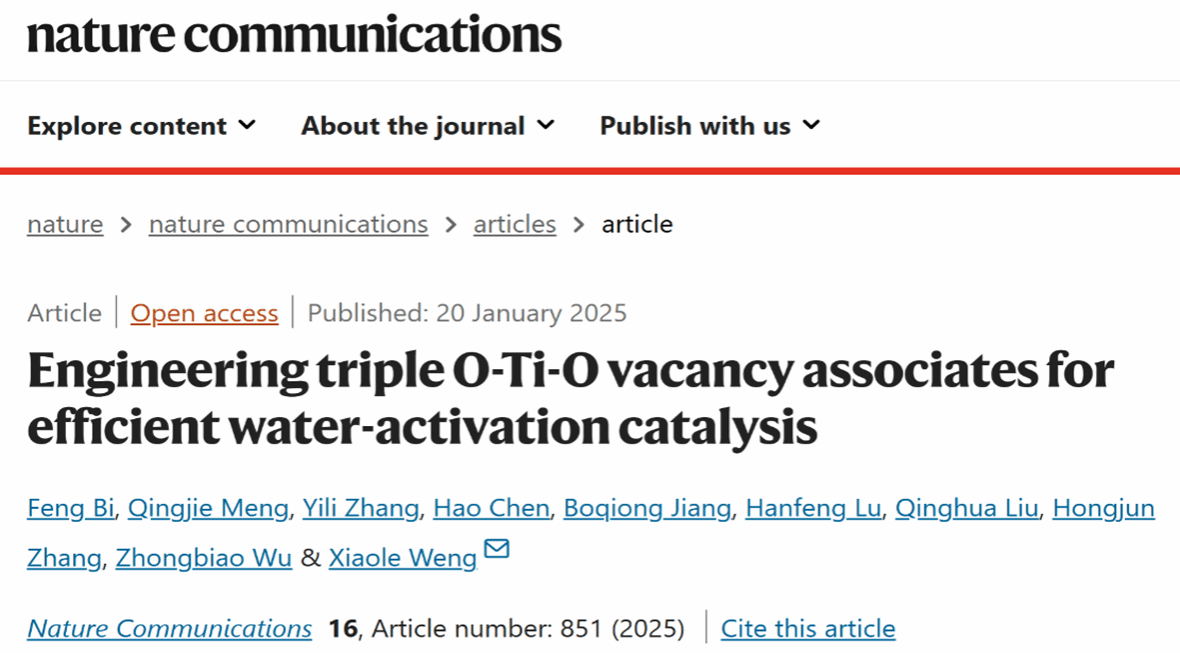 近日,吃瓜网 孟庆洁副教授与浙江大学翁小乐教授团队合作,在缺陷工程调控涉水催化反应方面取得重要进展,研究成果“Engineering triple O-Ti-O vacancy associates for efficient water-activation catalysis”发表于国际知名期刊《Nature Communications》。浙江大学毕峰与吃瓜网 孟庆洁共同担任第一作者。
